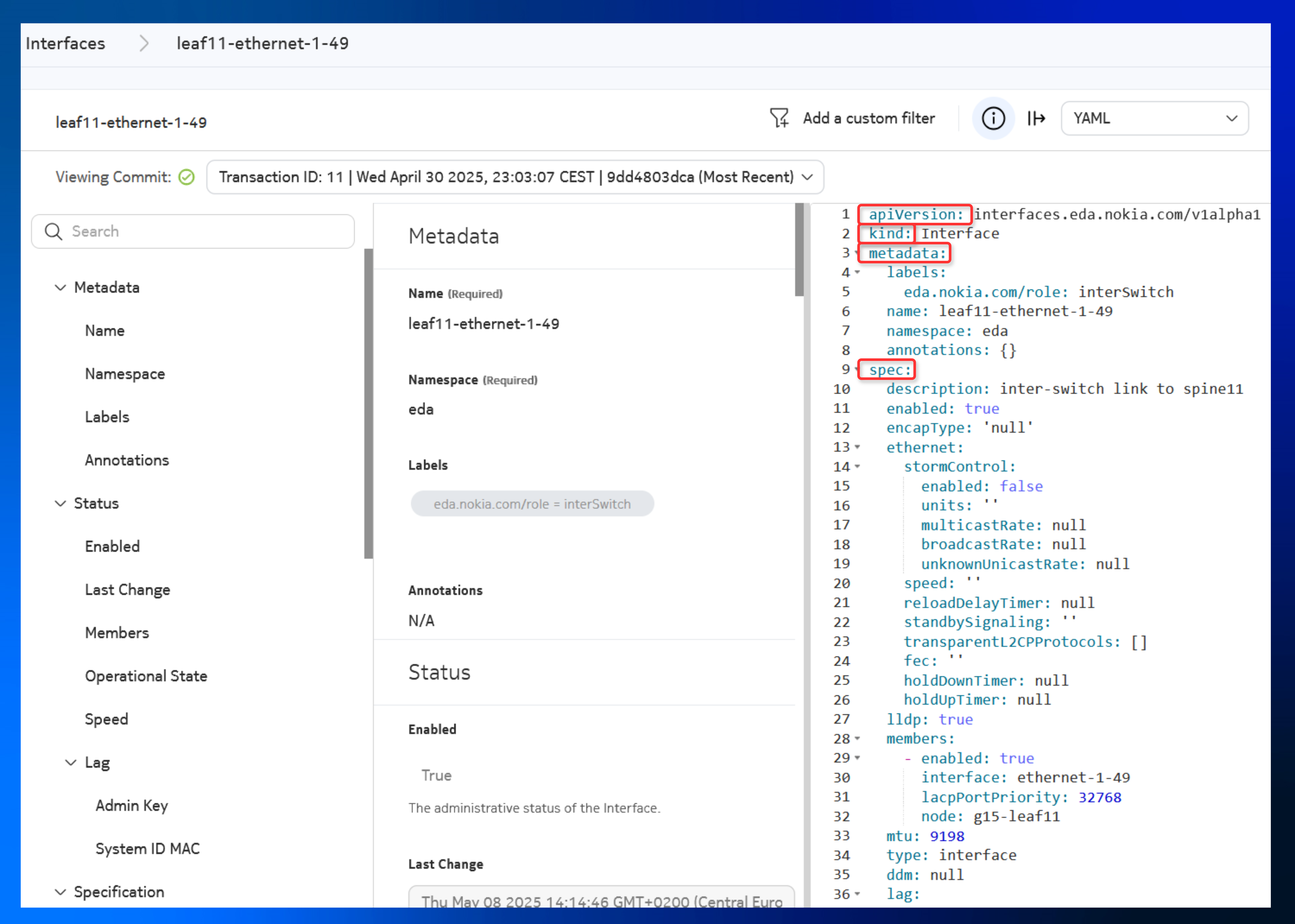If you navigate in the EDA Ui to the TOPOLOGY → IInterfaces and click for example on leaf11-ethernet-1-49, or visit the EDA API documentation ( icon in the top right), you'll notice that the resource definitions appear the same, only the format differs (YAML vs. JSON):