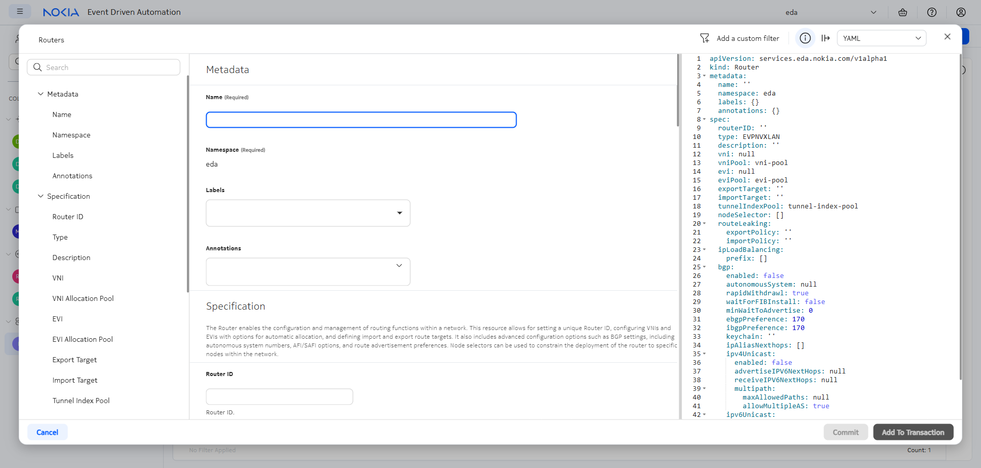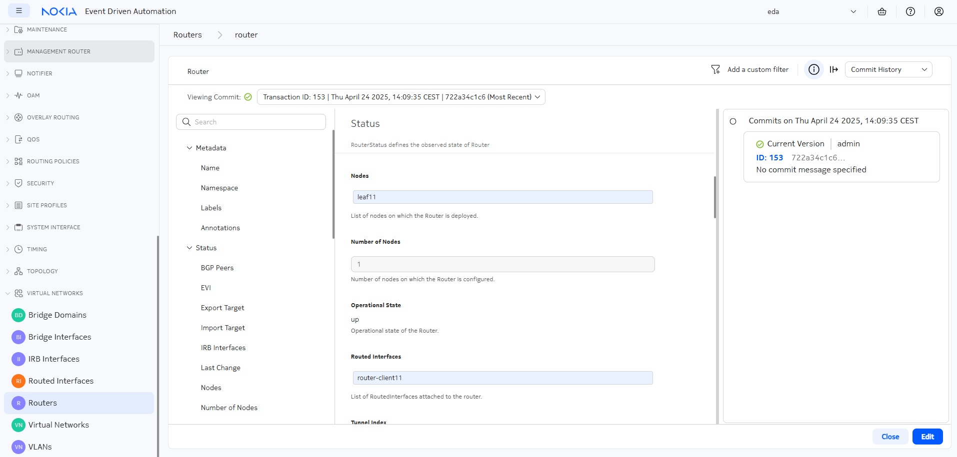 When you are finished, you can press the Commit button to commit the transaction1 right away which will result in EDA verifying the correctness of the Router configuration and... It will store the Router resource in the EDA database, but no config will be pushed to the nodes. Why, you ask?